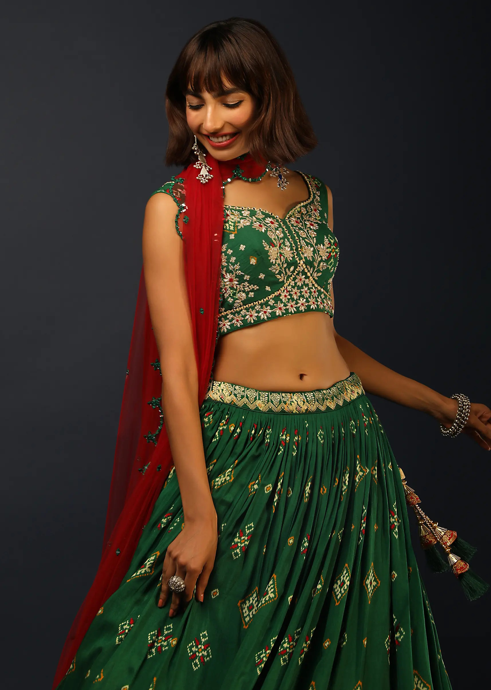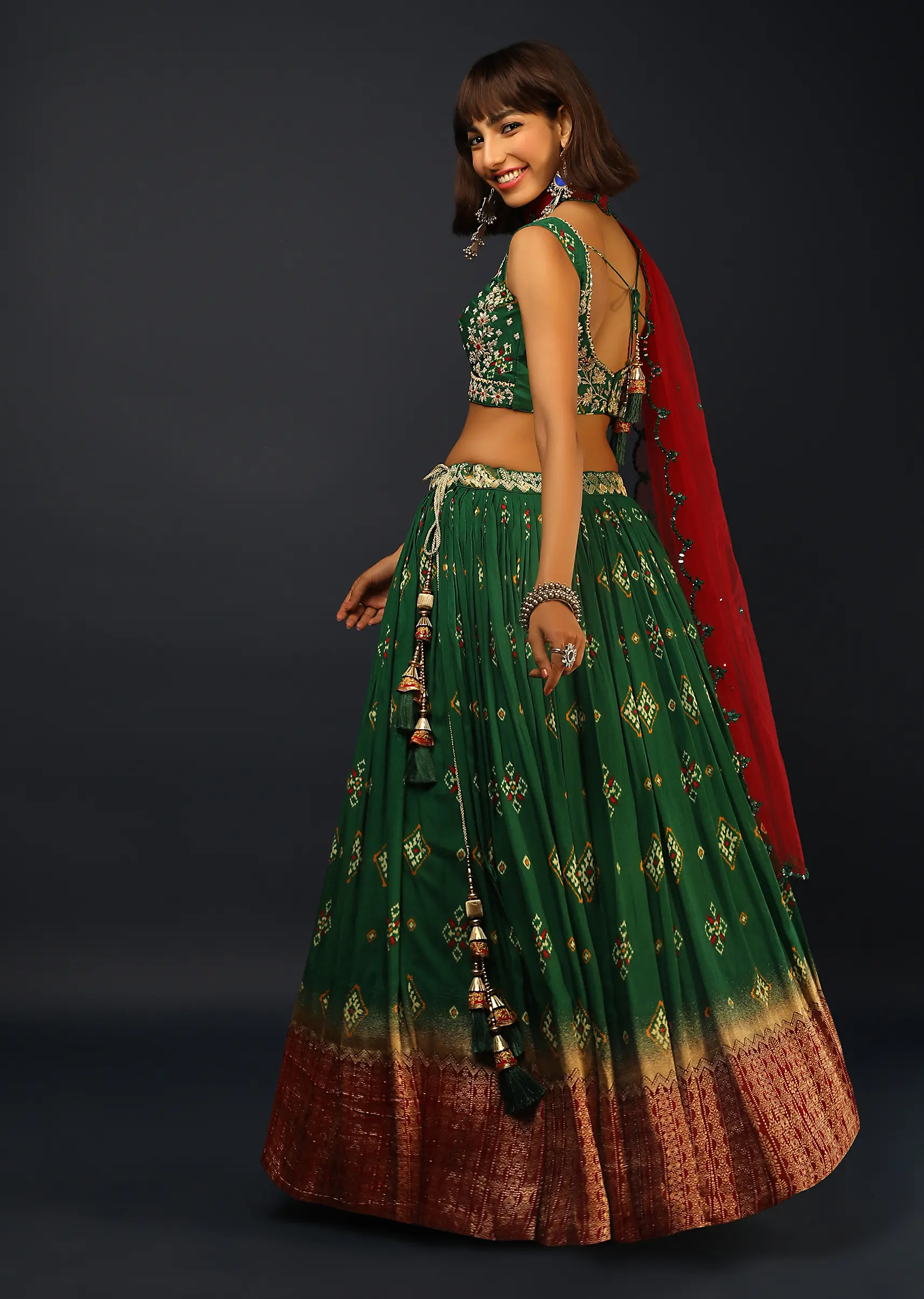 Bottle green lehenga in silk with patola printed buttis and woven maroon border.