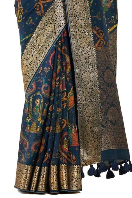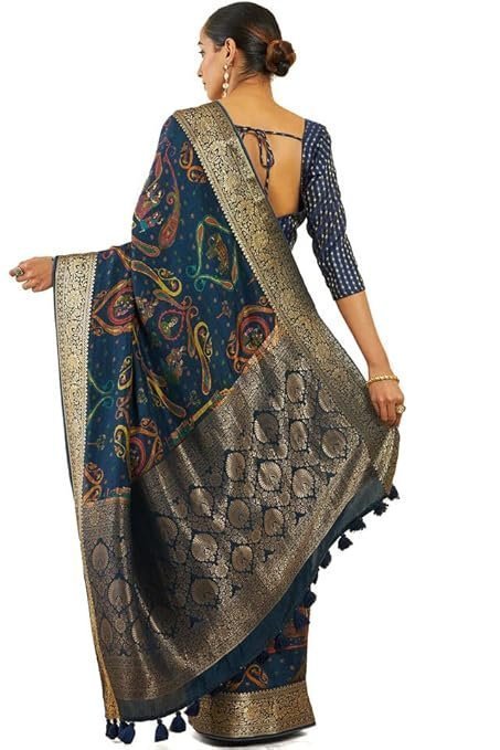 Soch Womens Navy Blue Crepe Saree With Ethnic Print And Zari Borders